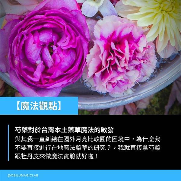 我就直接拿芍藥跟牡丹皮來做魔法實驗就好啦!,為什麼我不可以有對於在地藥草魔性的研究呢?說到這,其實早期的我真的很愛追尋國外藥草,甚至到了一種走火入魔的程度,國外工作者有他們自己對於他們土地上魔法藥草的研究,為什麼我不能有對自己土地上魔法藥草的研究呢?這樣的契機讓我有了想發展台灣本土藥草魔法的念頭,但後續發展時卻遇到了一個瓶頸,雖然我可以藉由西方的研究方法,來幫助我更加理解台灣這塊土地上的魔法藥草,但我會不會是拿著西方的眼光在看待本土魔法藥草,而不是拿在地的眼光在看待本土魔法藥草?因為這件事,才讓我想把台灣本土藥草魔法再推往下一個階段:「如何以在地眼光看待本土藥草」,也因此才有了台灣本土藥草魔法的進階課程。在這門課程中,雖說魔法工具的使用上仍是外來的,但在魔法藥草內涵與配方調配上卻是屬於台灣在地的。