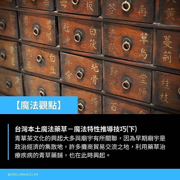 也因為鄰近廟宇之緣故,神明賜藥的傳說,皆可在青草藥舖尋求到蹤影。從依循著藥籤的籤詩來抓藥,或是依照神明指示來尋藥,這讓青草藥舖與人們的生活產生了連結,因而誕生了所謂的青草藥文化。