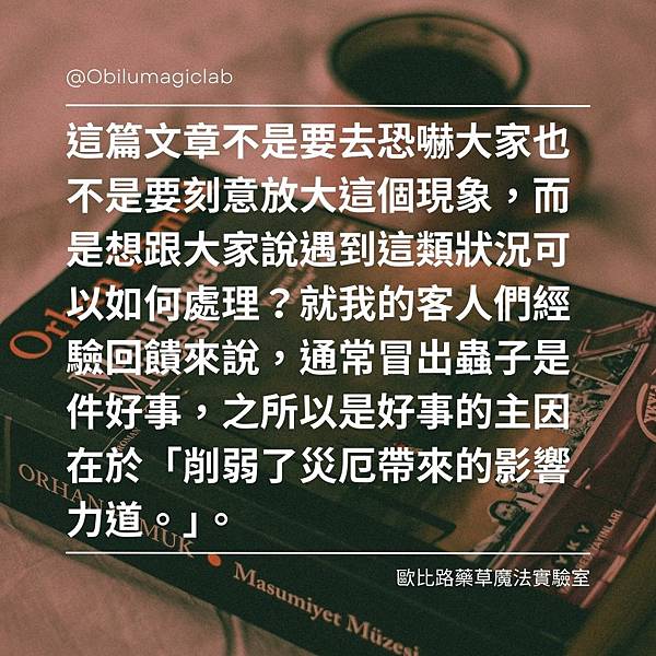 這篇文章不是要去恐嚇大家也不是要刻意放大這個現象,而是想跟大家說遇到這類狀況可以如何處理?接下來要談及的會比較個人化經驗的部分,不能跟各位保證能否類推到其他魔法工作者。就我的客人們經驗回饋來說,通常冒出蟲子是件好事,之所以是好事的主因在於「削弱了災厄帶來的影響力道。」。如果與保護職掌有關的神靈工作,如:蜘蛛女王;或是魔法咒瓶功能中有與保護、淨化、抵擋、跨越障礙有關的魔法,有上述這類現象出現時,我們應該感到欣慰,因為我們終於看到魔法咒瓶的工作跡象了。