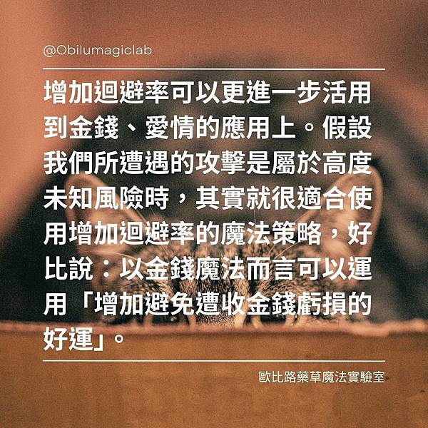 後來在反覆操作的經驗中,發現到其實增加迴避率可以更進一步活用到金錢、愛情的應用上。假設我們所遭遇的攻擊是屬於高度未知風險時,其實就很適合使用增加迴避率的魔法策略,好比說:以金錢魔法而言可以運用「增加避免遭收金錢虧損的好運」;以愛情魔法來說則可以運用「增加避免遇到恐怖情人接近的好運」。
